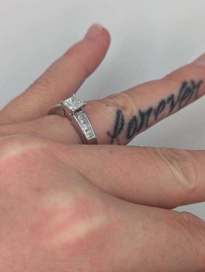 - Brilliant Sparkle: The natural princess cut center diamond and the sparkling side stones together create a dazzling display of brilliance and fire.